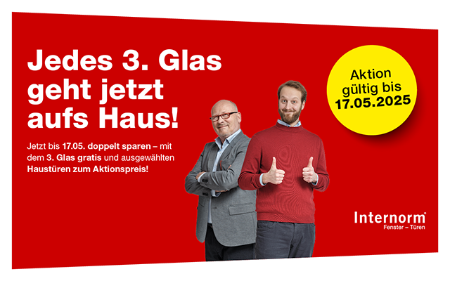 Ob Neubau oder Sanierung – jetzt gibt’s bei Bestellung bis 17.05.2025 bei allen Internorm-Fenstern das 3. Glas gratis und ausgewählte Haustüren zum sensationellen Aktionspreis*